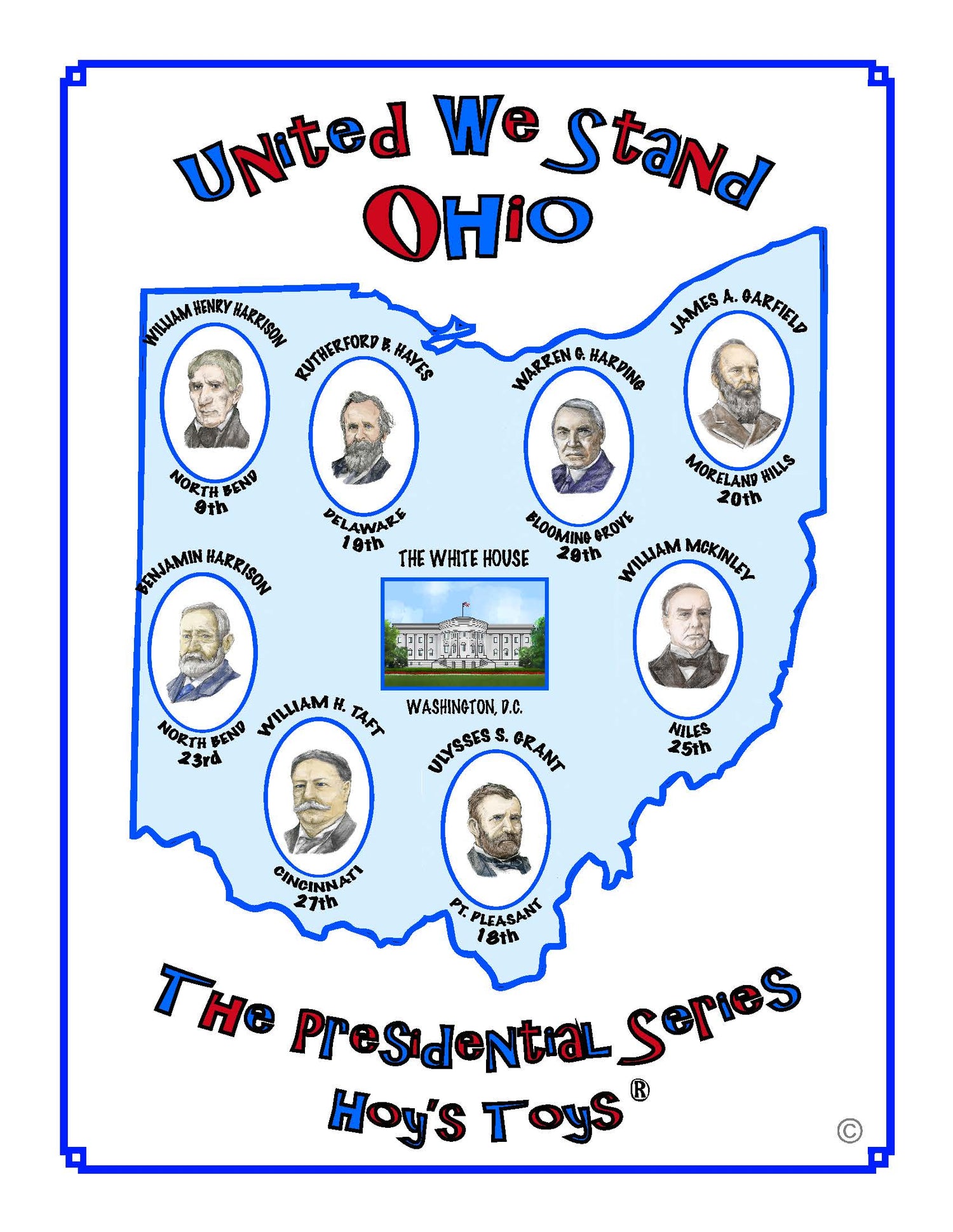 Ohio's rich and thorough history inspired Hoy's Toys United We Stand Ohio the Presidential Series. The Presidents from Ohio contributed so much during critical and pivotal times through the Civil War and the technology boom that changed the United States and the world. The Presidents and First Ladies worked tirelessly towards abolition, the Women's Suffrage Movement, and safety standards in federal workplaces. Ohio proved to have solid and dependable leaders for the USA and the world.